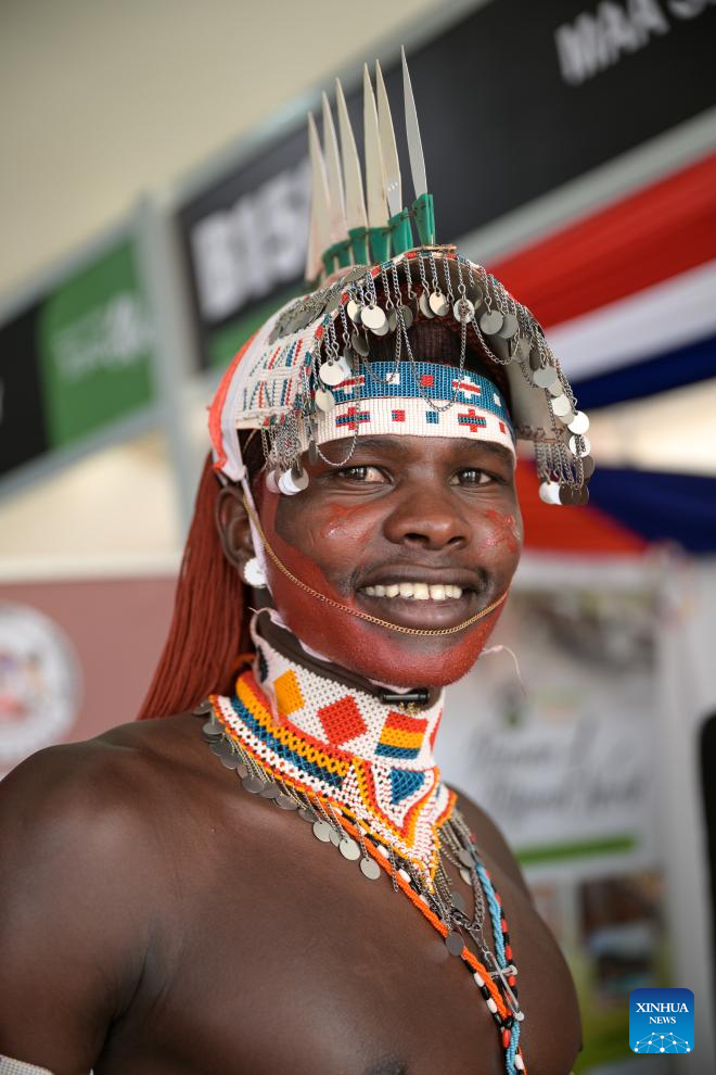 A Maasai man in traditional costumes is seen at the 15th edition of the Magical Kenya Travel Expo in Nairobi, Kenya, Oct. 2, 2025. Kenya is hosting the three-day expo, running until Friday, which has attracted 6,500 delegates from 40 countries, including tourism ministers, city mayors, investors, travel enthusiasts, and promoters. (Xinhua/Yang Guang)