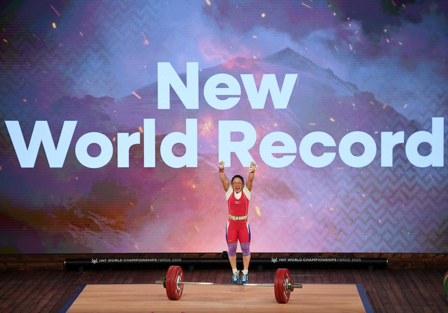 FORDE, Norway, Oct. 2 (Xinhua) -- Ri Song Gum of the Democratic People's Republic of Korea emerged as the biggest winner on the opening day of the International Weightlifting Federation (IWF) World Championships, breaking the women's 48kg world records on total and in clean and jerk to claim three gold medals on Thursday.