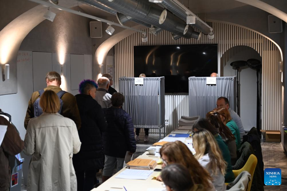 Citizens line up outside a polling station in Prague, the Czech Republic, Oct. 3, 2025. The two-day nationwide parliamentary elections will determine the 200 seats in the Chamber of Deputies, the lower house of parliament. (Xinhua/Zhang Haofu)