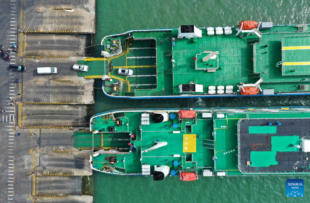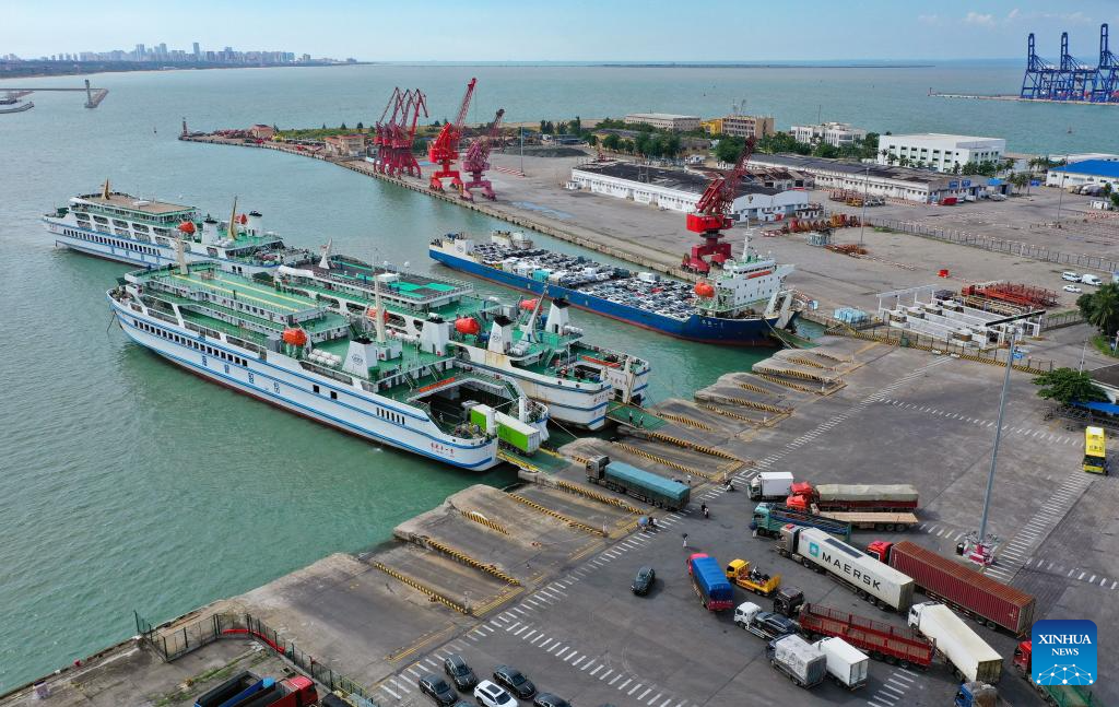 An aerial drone photo taken on Oct. 4, 2025 shows passengers ships at Xiuying Port of Haikou, south China's Hainan Province. As Typhoon Matmo, the 21st named storm of the 2025 Pacific typhoon season, approaches, the provincial committee for disaster prevention, mitigation and relief upgraded their emergency typhoon response for vessels and marine operations in affected sea areas to Level III from a Level-IV emergency response at 8:30 a.m. on Saturday. (Xinhua/Guo Cheng)
