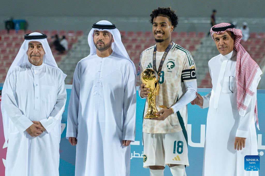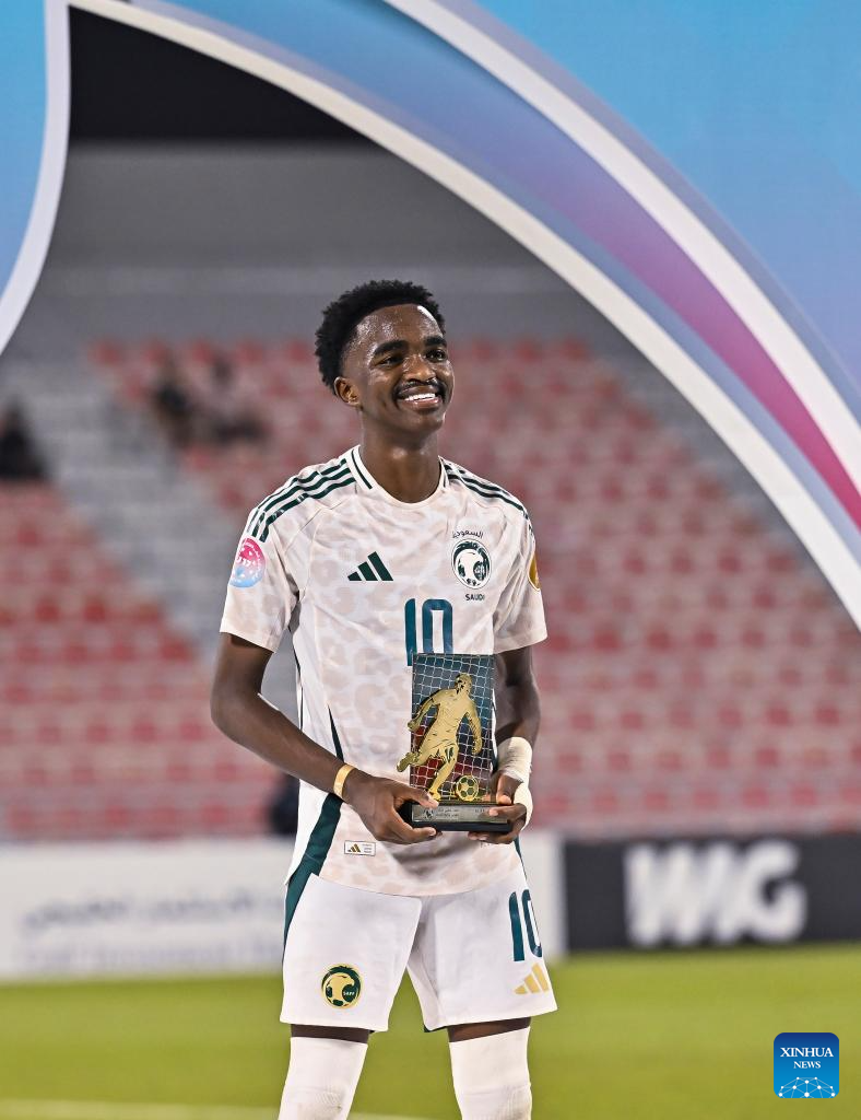 Abdulrahman Sufyani of Saudi Arabia poses with the best player trophy after the Arab Gulf Cup Football Federation (AGCFF) U-17 Gulf Cup Qatar 2025 final football match between Saudi Arabia and the United Arab Emirates in Doha, Qatar, Oct. 3, 2025. (Photo by Nikku/Xinhua)