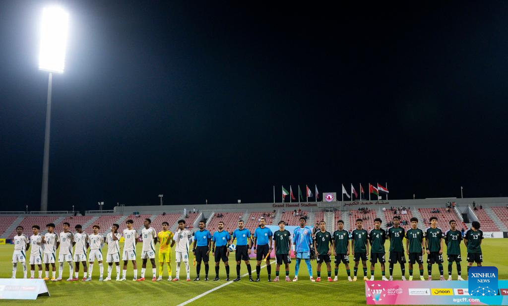 Players and referees line up prior to the Arab Gulf Cup Football Federation (AGCFF) U-17 Gulf Cup Qatar 2025 final football match between Saudi Arabia and the United Arab Emirates in Doha, Qatar, Oct. 3, 2025. (Photo by Nikku/Xinhua)