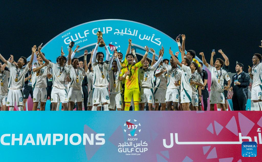 Players of Saudi Arabia celebrate with trophy after winning the Arab Gulf Cup Football Federation (AGCFF) U-17 Gulf Cup Qatar 2025 final football match between Saudi Arabia and the United Arab Emirates in Doha, Qatar, Oct. 3, 2025. (Photo by Nikku/Xinhua)