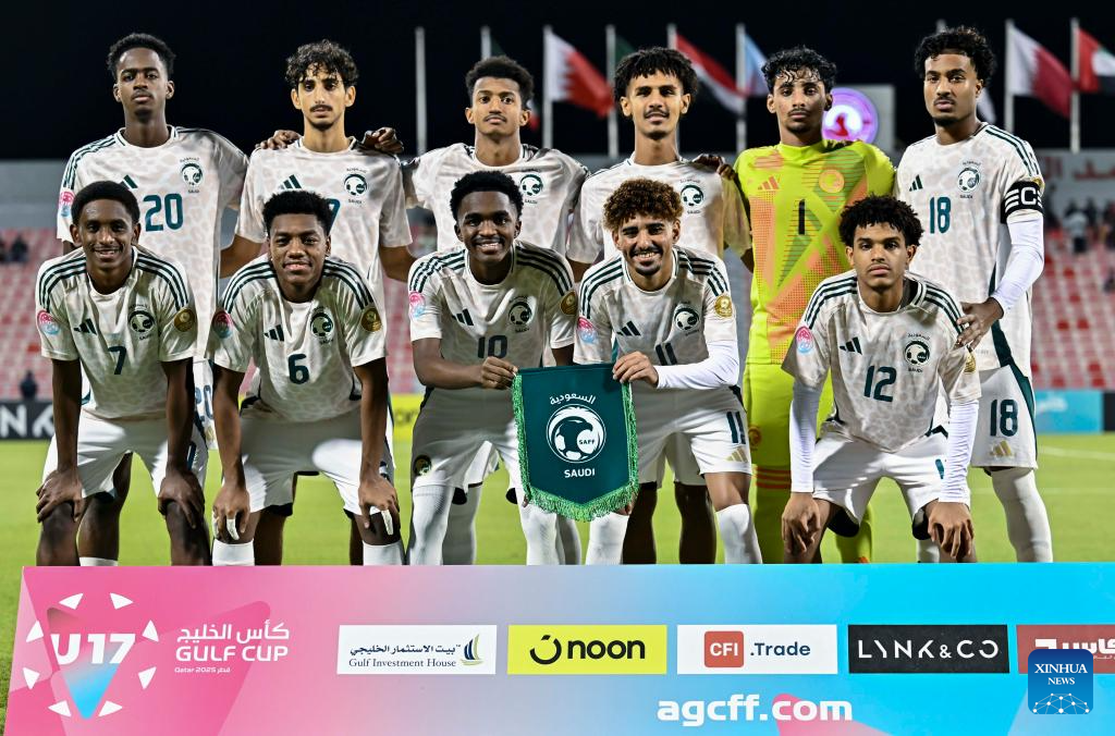 Starting players of Saudi Arabia pose for a group photo prior to the Arab Gulf Cup Football Federation (AGCFF) U-17 Gulf Cup Qatar 2025 final football match between Saudi Arabia and the United Arab Emirates in Doha, Qatar, Oct. 3, 2025. (Photo by Nikku/Xinhua)