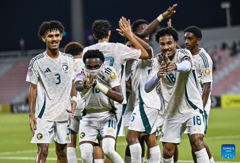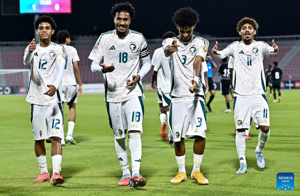 Abdulaziz Alfawaz (2nd L) of Saudi Arabia celebrates with his teammates after scoring the opening goal during the Arab Gulf Cup Football Federation (AGCFF) U-17 Gulf Cup Qatar 2025 final football match between Saudi Arabia and the United Arab Emirates in Doha, Qatar, Oct. 3, 2025. (Photo by Nikku/Xinhua)