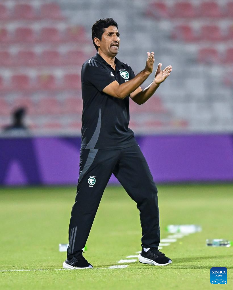Head coach of Saudi Arabia Abdulwahab Nasser Alharbi reacts during the Arab Gulf Cup Football Federation (AGCFF) U-17 Gulf Cup Qatar 2025 final football match between Saudi Arabia and the United Arab Emirates in Doha, Qatar, Oct. 3, 2025. (Photo by Nikku/Xinhua)