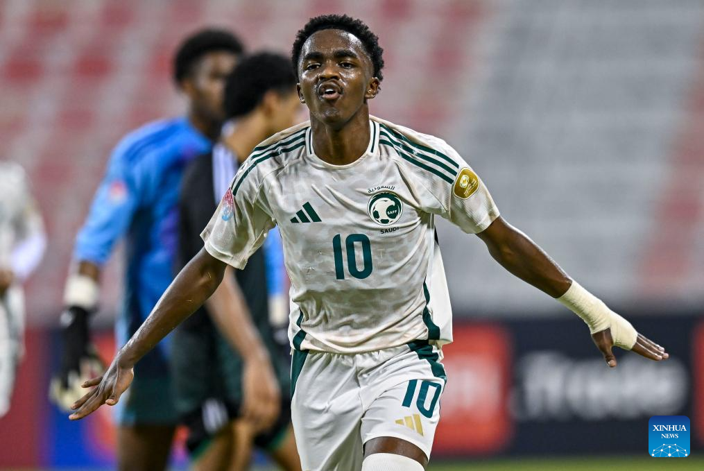 Abdulrahman Sufyani of Saudi Arabia celebrates after scoring the second goal during the Arab Gulf Cup Football Federation (AGCFF) U-17 Gulf Cup Qatar 2025 final football match between Saudi Arabia and the United Arab Emirates in Doha, Qatar, Oct. 3, 2025. (Photo by Nikku/Xinhua)