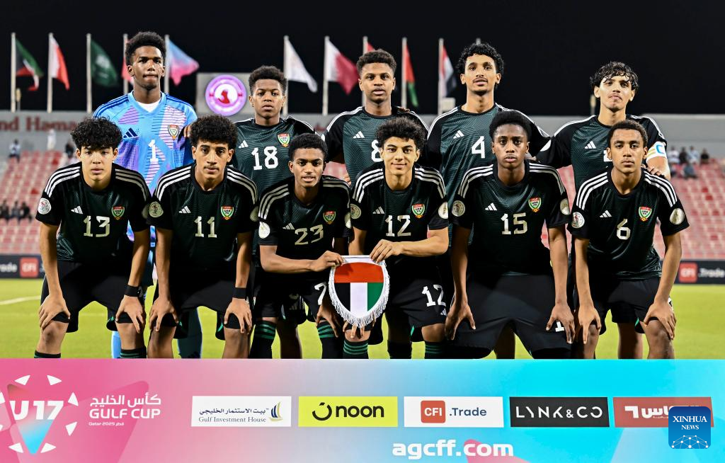 Starting players of the United Arab Emirates pose for a group photo prior to the Arab Gulf Cup Football Federation (AGCFF) U-17 Gulf Cup Qatar 2025 final football match between Saudi Arabia and the United Arab Emirates in Doha, Qatar, Oct. 3, 2025. (Photo by Nikku/Xinhua)