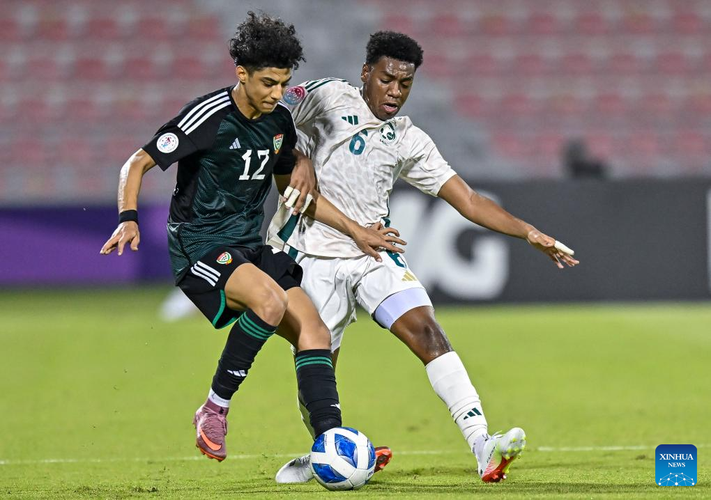 Saeed Aldossari (R) of Saudi Arabia vies with Ali Hassan Alblooshi of the United Arab Emirates during the Arab Gulf Cup Football Federation (AGCFF) U-17 Gulf Cup Qatar 2025 final football match between Saudi Arabia and the United Arab Emirates in Doha, Qatar, Oct. 3, 2025. (Photo by Nikku/Xinhua)