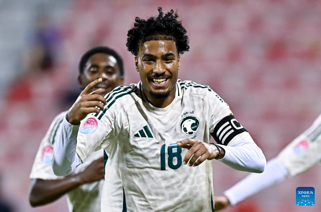 Abdulaziz Alfawaz of Saudi Arabia celebrates after scoring the opening goal during the Arab Gulf Cup Football Federation (AGCFF) U-17 Gulf Cup Qatar 2025 final football match between Saudi Arabia and the United Arab Emirates in Doha, Qatar, Oct. 3, 2025. (Photo by Nikku/Xinhua)