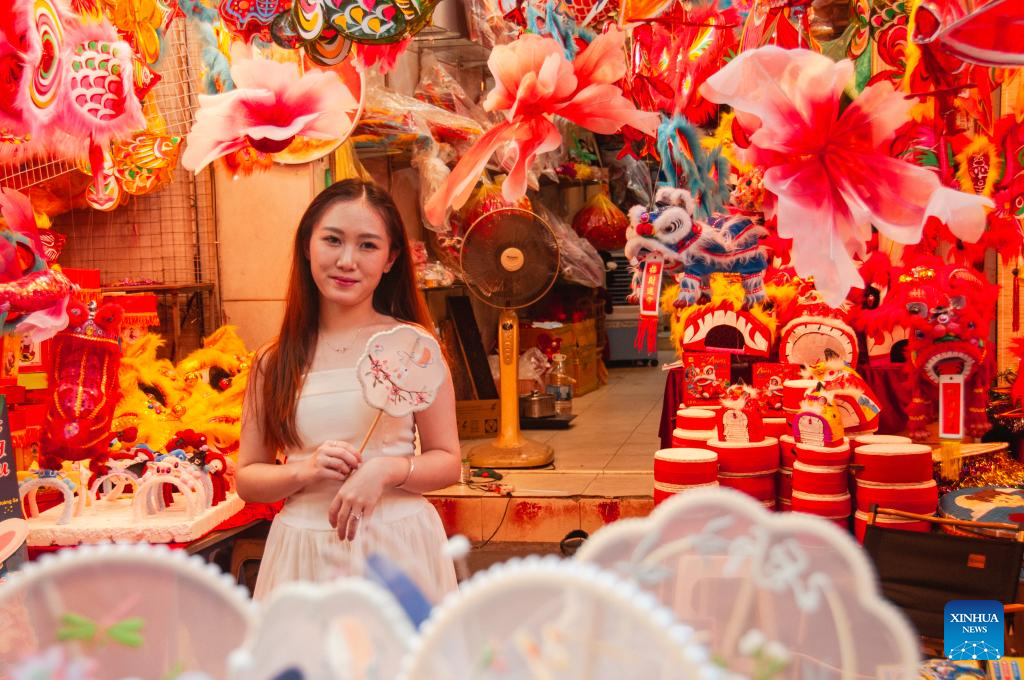 A woman poses among decorations at Hang Ma Street in Hanoi, Vietnam, Oct. 3, 2025. Hanoi's Hang Ma Street is brightly decorated with lanterns and festive items for the upcoming Mid-Autumn Festival. (Photo by Dang Hong Dung/Xinhua)