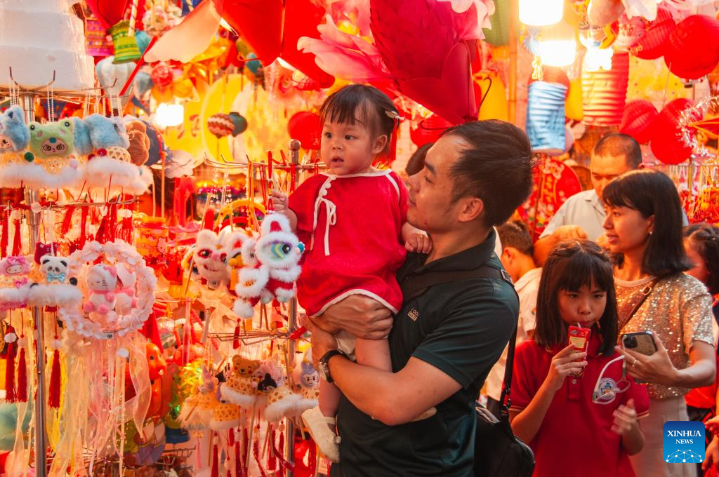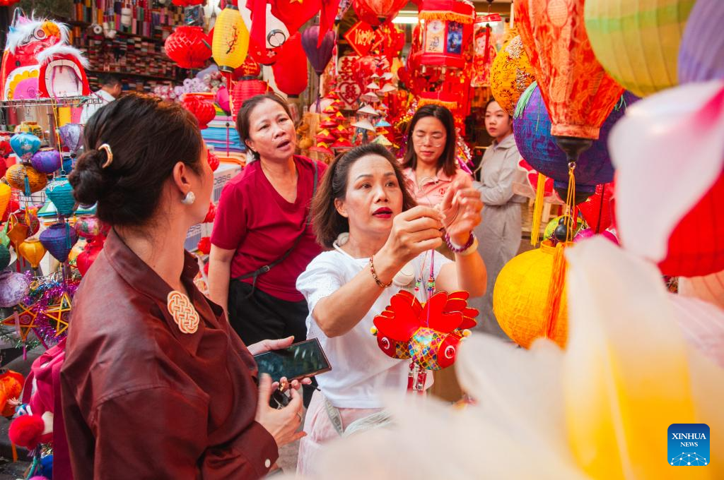 People shop for the Mid-Autumn Festival at Hang Ma Street in Hanoi, Vietnam, Oct. 3, 2025. Hanoi's Hang Ma Street is brightly decorated with lanterns and festive items for the upcoming Mid-Autumn Festival. (Photo by Dang Hong Dung/Xinhua)