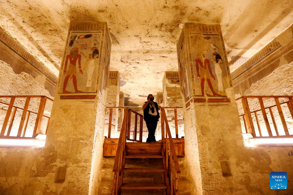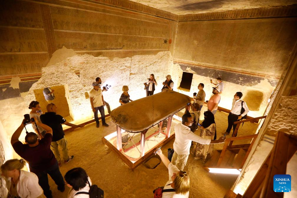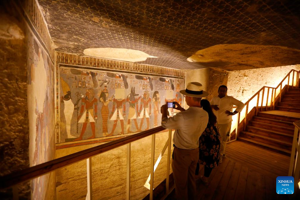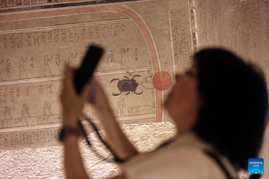 Tourists visit the tomb of New Kingdom Pharaoh Amenhotep III in the Valley of the Kings on the West Bank of Luxor, Egypt, on Oct. 4, 2025. Egypt's Ministry of Tourism and Antiquities on Saturday opened the tomb of New Kingdom Pharaoh Amenhotep III in the Valley of the Kings to visitors, following more than two decades of restoration. The tomb, belonging to Amenhotep III who ruled Egypt more than 3,500 years ago, is situated on the western side of the famed necropolis. Egyptian antiquities authorities said it was first discovered in 1799 and subsequently looted, including the sarcophagus. (Xinhua/Ahmed Gomaa)