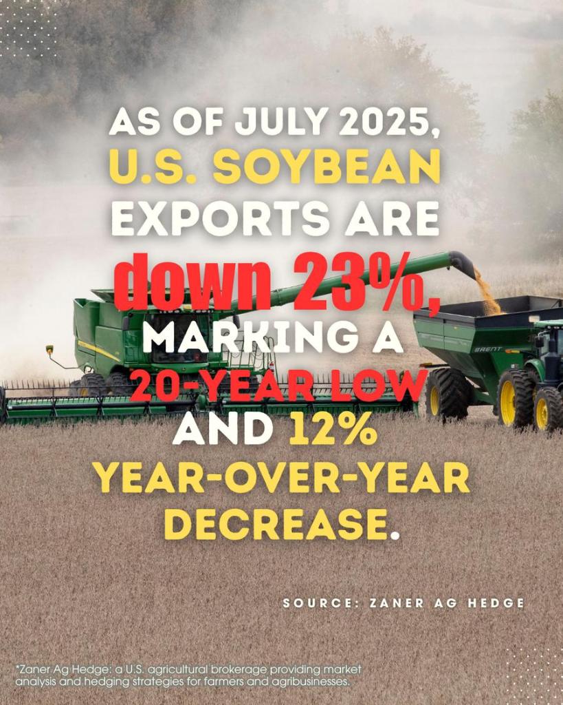 As of July 2025, U.S. soybean exports are down 23%, a 20-year low and 12% year-over-year decrease.