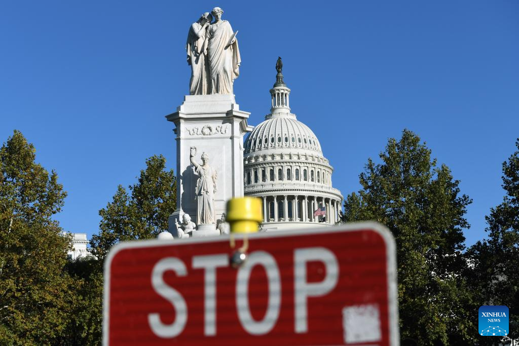 A stop sign is seen in front of the U.S. Capitol building in Washington, D.C., the United States, Oct. 5, 2025. As the U.S. federal government entered a shutdown -- the first time in nearly seven years -- the confrontation between President Donald Trump's administration and the Democratic Party has further escalated.