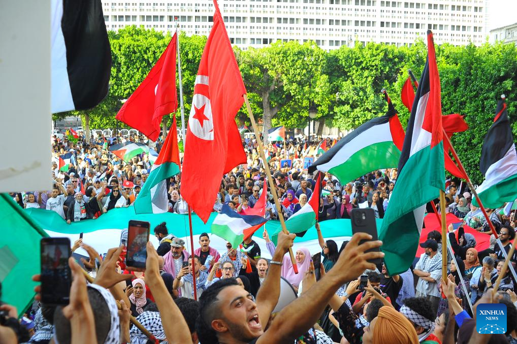 People gather to protest against Israel's interception of the Global Sumud Flotilla, at the center of Tunis, Tunisia, Oct. 4, 2025. Global Sumud Flotilla is an aid mission attempting to deliver humanitarian aid to Gaza. (Photo by Adel Ezzine/Xinhua)