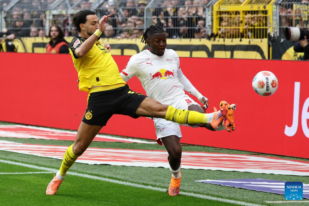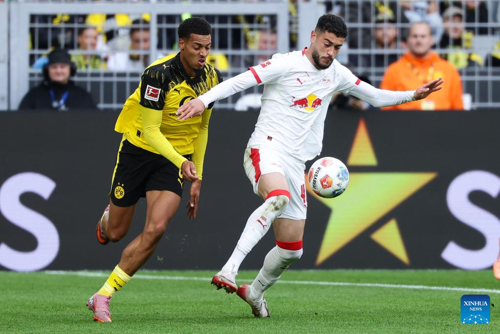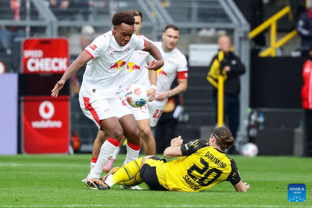 Maximilian Beier (L) of Borussia Dortmund vies with Assan Ouedraogo of RB Leipzig during the German first division Bundesliga football match between Borussia Dortmund and RB Leipzig in Dortmund, Germany, Oct. 4, 2025. (Photo by Joachim Bywaletz/Xinhua)