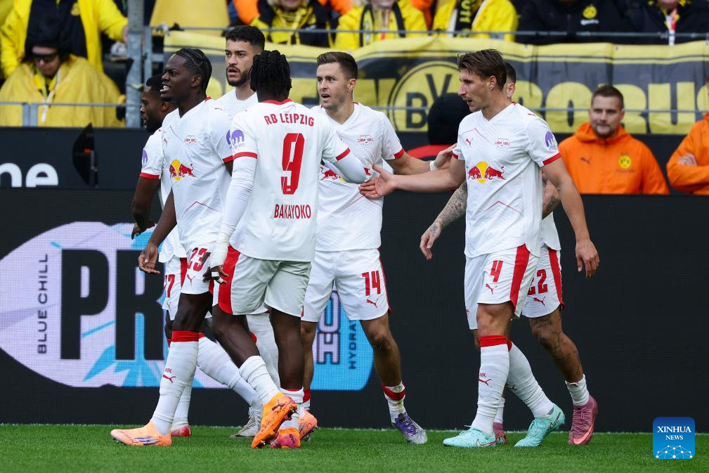 Christoph Baumgartner (3rd R) of RB Leipzig celebrates his goal with his teammates during the German first division Bundesliga football match between Borussia Dortmund and RB Leipzig in Dortmund, Germany, Oct. 4, 2025. (Photo by Joachim Bywaletz/Xinhua)