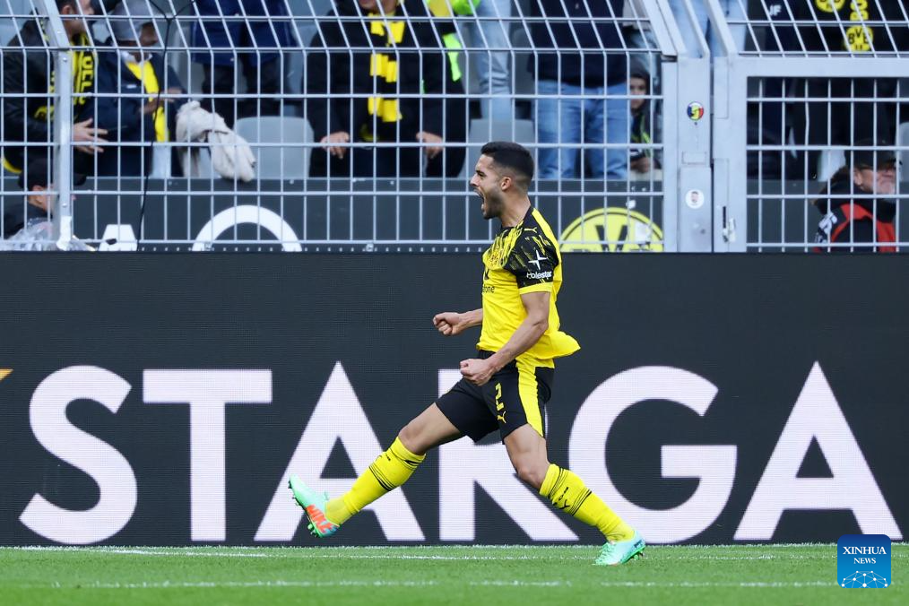 Yan Couto of Borussia Dortmund celebrates after scoring during the German first division Bundesliga football match between Borussia Dortmund and RB Leipzig in Dortmund, Germany, Oct. 4, 2025. (Photo by Joachim Bywaletz/Xinhua)