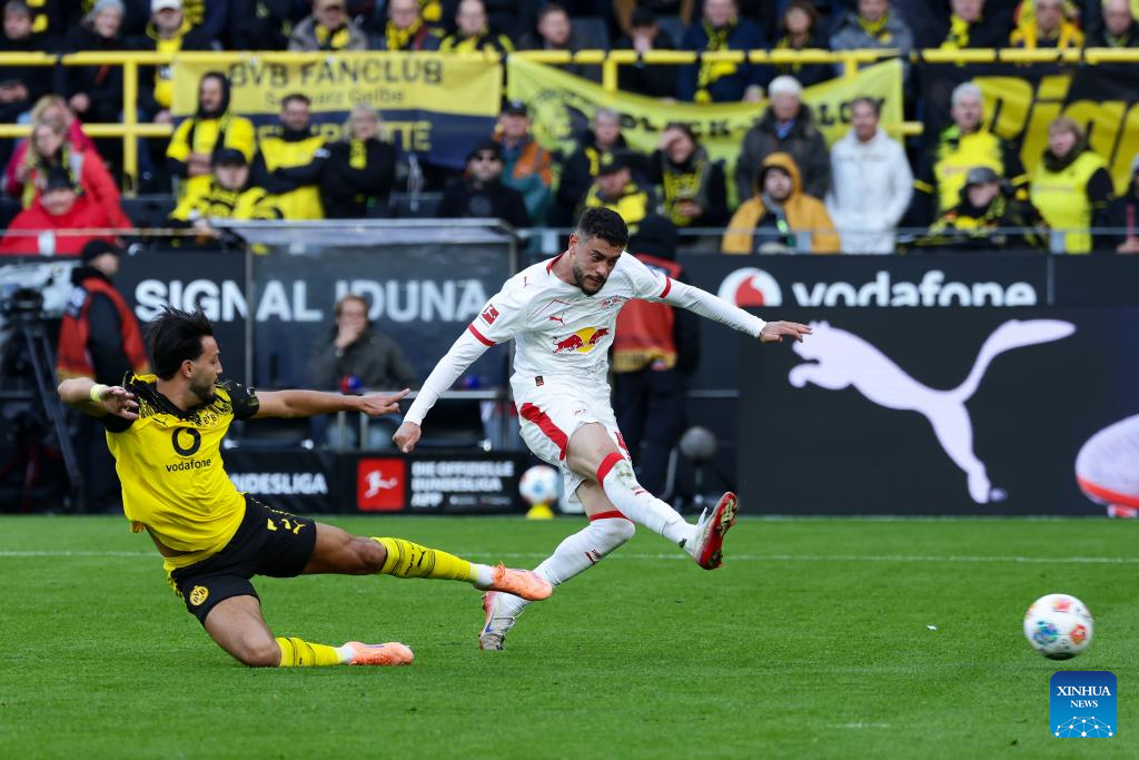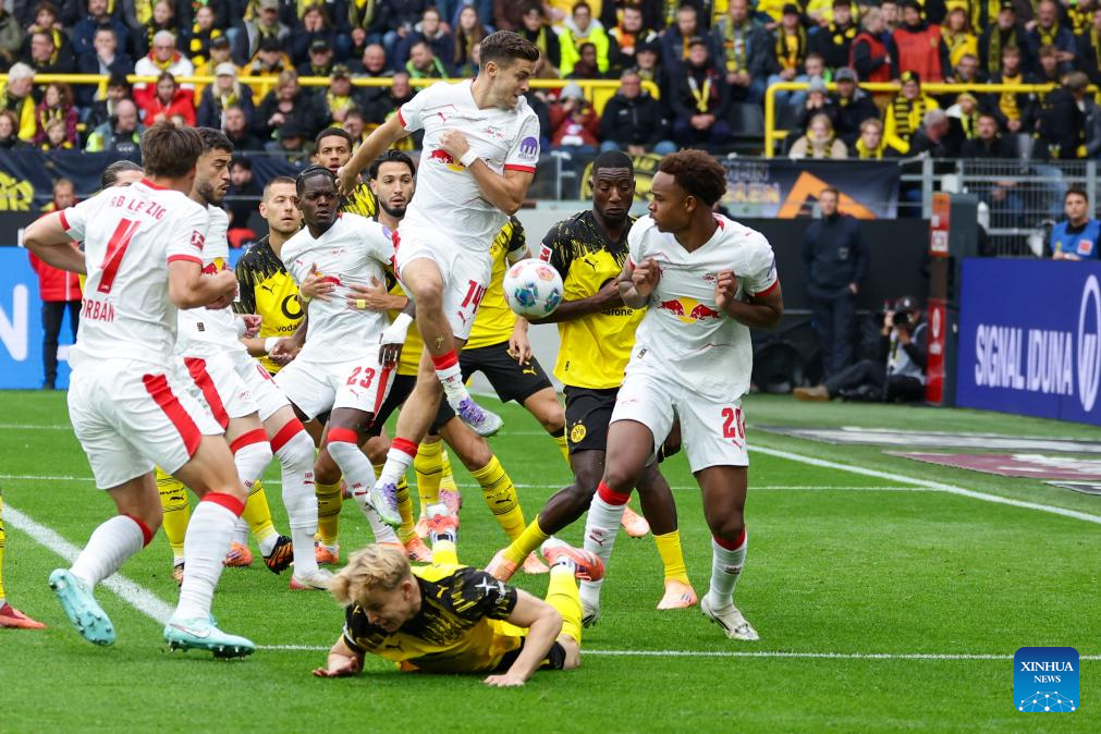 Serhou Guirassy (2nd R) of Borussia Dortmund vies with Christoph Baumgartner (top) and Assan Ouedraogo (1st R) of RB Leipzig during the German first division Bundesliga football match between Borussia Dortmund and RB Leipzig in Dortmund, Germany, Oct. 4, 2025. (Photo by Joachim Bywaletz/Xinhua)
