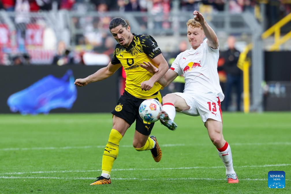 Marcel Sabitzer (R) of Borussia Dortmund vies with Assan Ouedraogo of RB Leipzig during the German first division Bundesliga football match between Borussia Dortmund and RB Leipzig in Dortmund, Germany, Oct. 4, 2025. (Photo by Joachim Bywaletz/Xinhua)