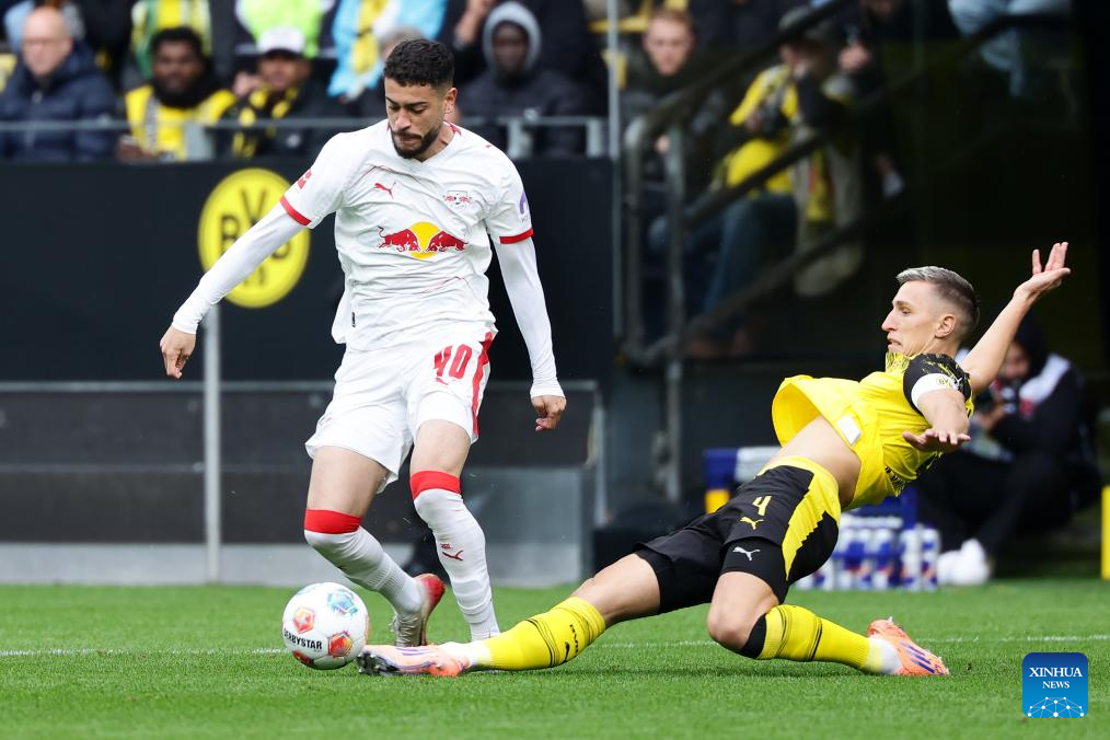 Nico Schlotterbeck (R) of Borussia Dortmund vies with Romulo Cardoso of RB Leipzig during the German first division Bundesliga football match between Borussia Dortmund and RB Leipzig in Dortmund, Germany, Oct. 4, 2025. (Photo by Joachim Bywaletz/Xinhua)