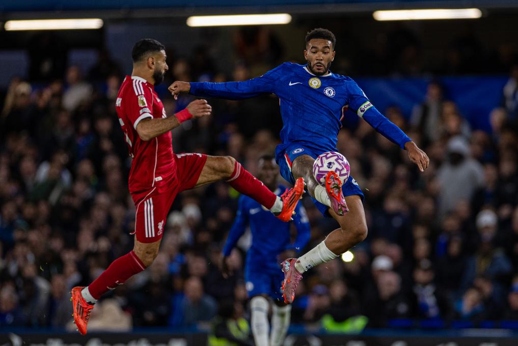 Liverpool's Mohamed Salah (L) challenges Chelsea's captain Reece James during the English Premier League match between Chelsea FC and Liverpool FC in London, Britain, on Oct. 4, 2025. (Xinhua)