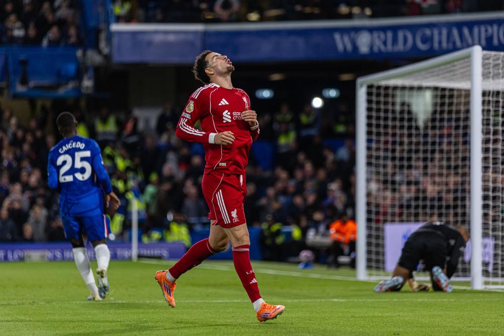 Liverpool's Curtis Jones reacts after missing a chance to score during the English Premier League match between Chelsea FC and Liverpool FC in London, Britain, on Oct. 4, 2025. (Xinhua)