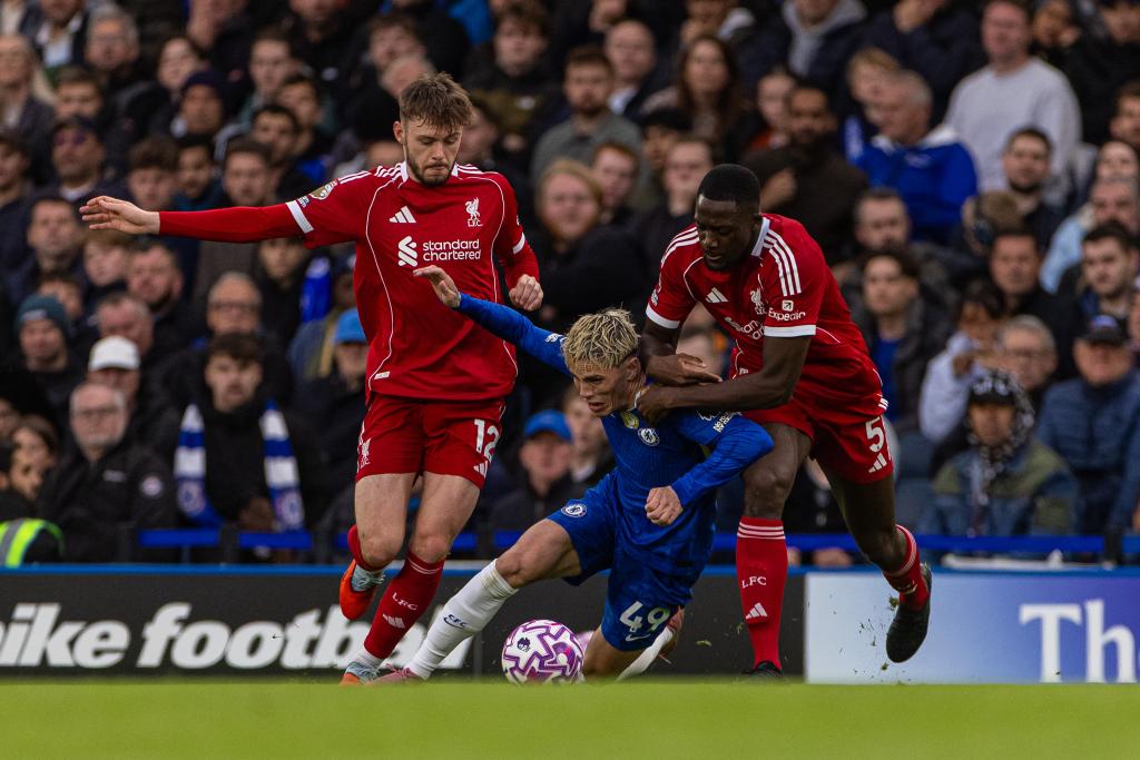 Liverpool's Conor Bradley (L) and Ibrahima Konate (R) challenge Chelsea's Alejandro Garnacho during the English Premier League match between Chelsea FC and Liverpool FC in London, Britain, on Oct. 4, 2025. (Xinhua)