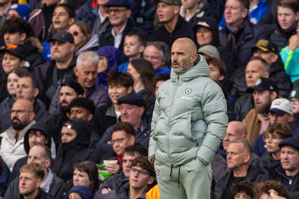 Chelsea's head coach Enzo Maresca reacts during the English Premier League match between Chelsea FC and Liverpool FC in London, Britain, on Oct. 4, 2025. (Xinhua)