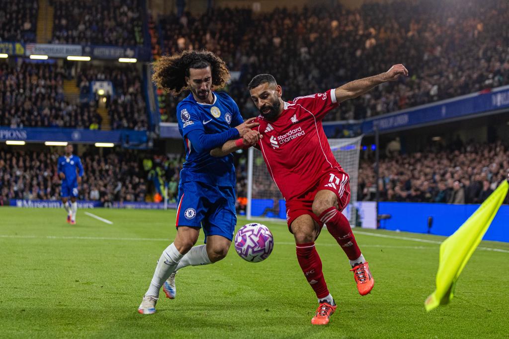 Chelsea's Marc Cucurella (L) challenges Liverpool's Mohamed Salah during the English Premier League match between Chelsea FC and Liverpool FC in London, Britain, on Oct. 4, 2025. (Xinhua)