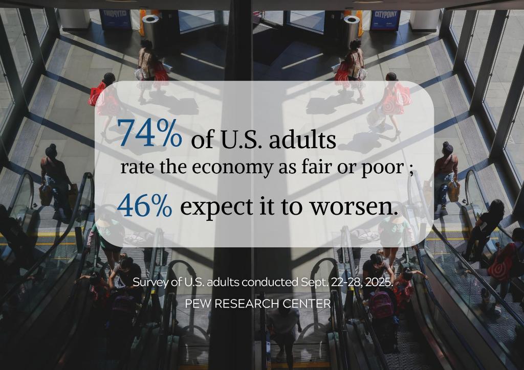 Most U.S. adults view the U.S. economy negatively, with 74% rating it as only fair or poor. Nearly half (46%) expect the U.S. economic conditions to worsen over the next year, according to a recent Pew Center poll.