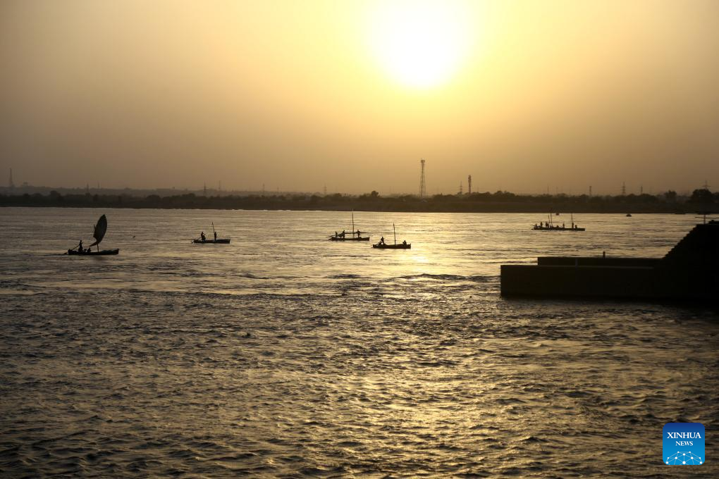 This photo taken on Oct. 4, 2025 shows fishermen's boats at sunset in southern Pakistan's Hyderabad. (Str/Xinhua)