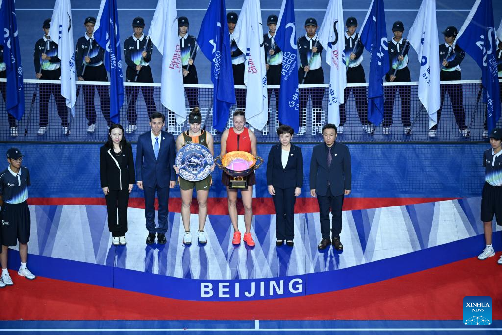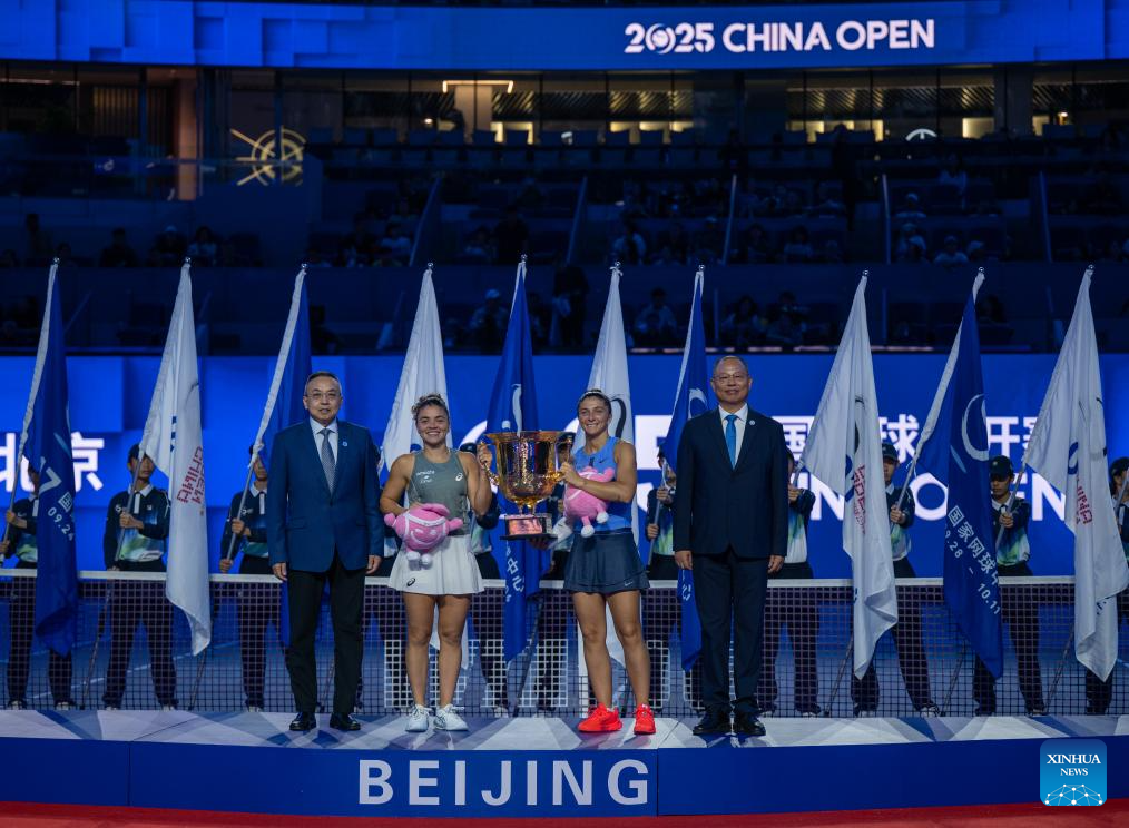 Amanda Anisimova (2nd L) celebrates during the awarding ceremony after the women's singles final match between Amanda Anisimova of the United States and Linda Noskova of the Czech Republic at 2025 China Open tennis tournament in Beijing, China, Oct. 5, 2025. (Xinhua/Hu Jingwen)