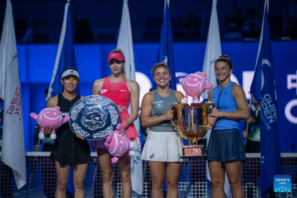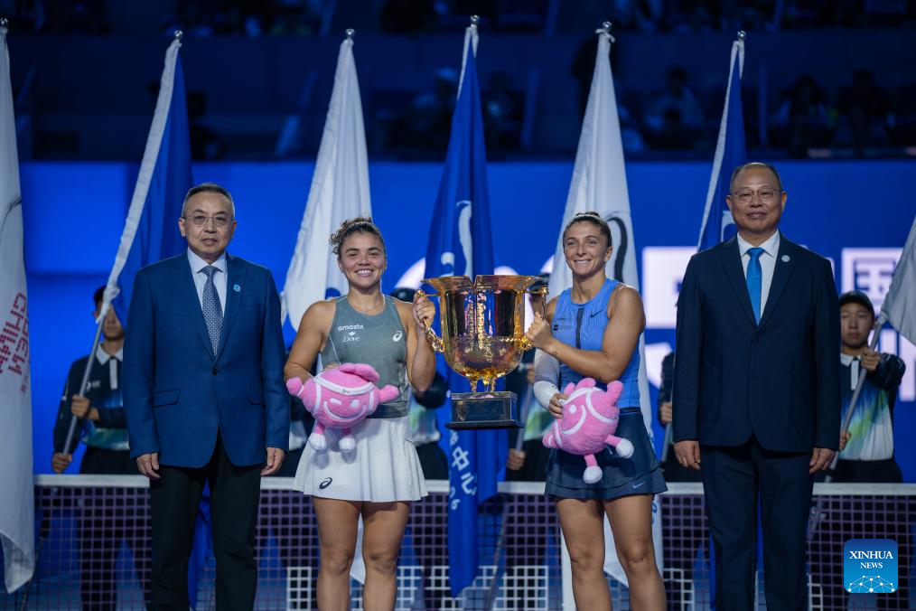 Sara Errani/Jasmine Paolini (L) pose for photos during the awarding ceremony for the women's doubles final between Kato Miyu (Japan)/Fanny Stollar (Hungary) and Sara Errani/Jasmine Paolini of Italy at 2025 China Open tennis tournament in Beijing, China, Oct. 5, 2025. (Xinhua/Hu Jingwen)