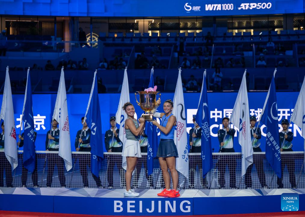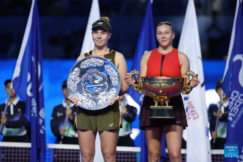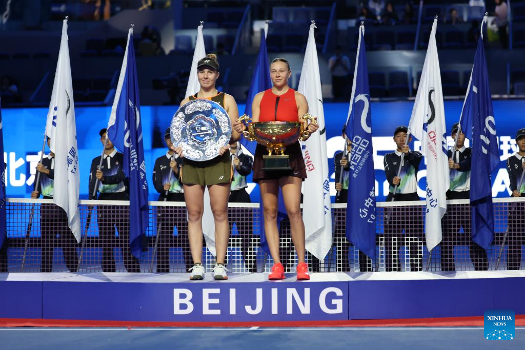 Winner Amanda Anisimova (R) and runner-up Linda Noskova pose for photos during the awarding ceremony after the women's singles final match between Amanda Anisimova of the United States and Linda Noskova of the Czech Republic at 2025 China Open tennis tournament in Beijing, China, Oct. 5, 2025. (Xinhua/Bai Xuefei)
