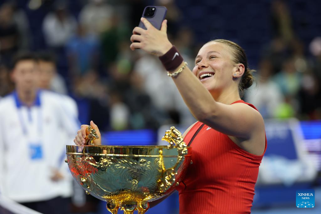 Amanda Anisimova takes a selfie during the awarding ceremony after the women's singles final match between Amanda Anisimova of the United States and Linda Noskova of the Czech Republic at 2025 China Open tennis tournament in Beijing, China, Oct. 5, 2025. (Xinhua/Bai Xuefei)