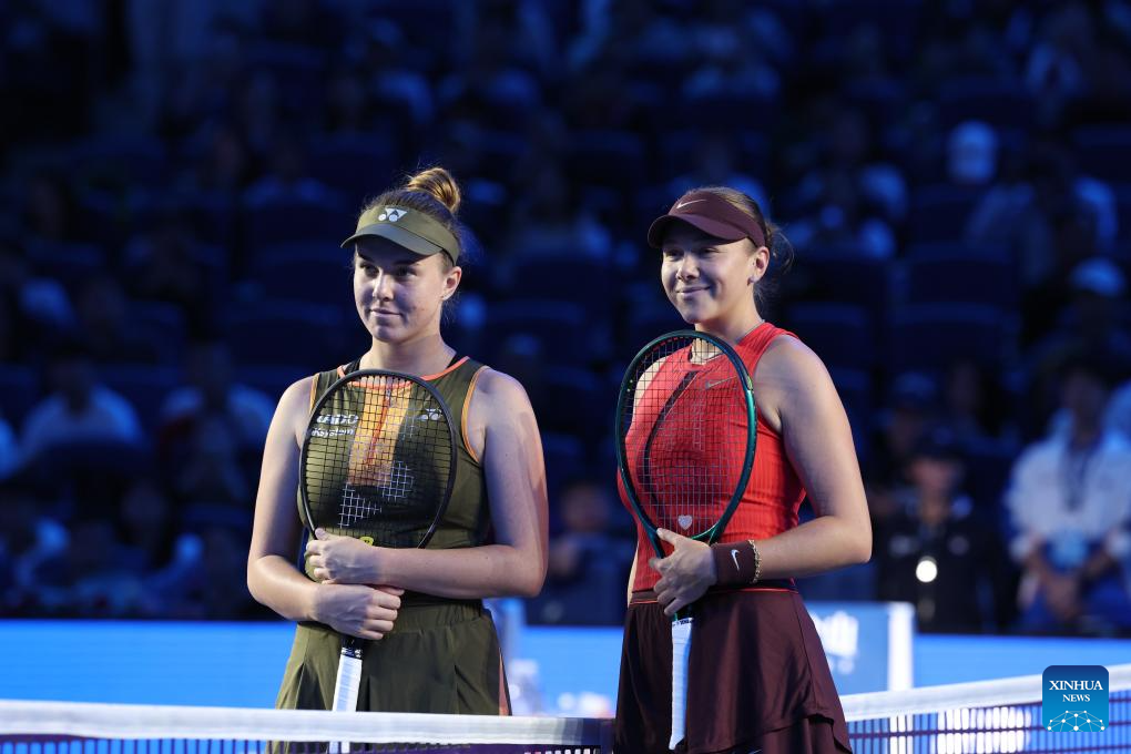 Amanda Anisimova (R) and Linda Noskova pose for photos before the women's singles final match between Amanda Anisimova of the United States and Linda Noskova of the Czech Republic at 2025 China Open tennis tournament in Beijing, China, Oct. 5, 2025. (Xinhua/Bai Xuefei)