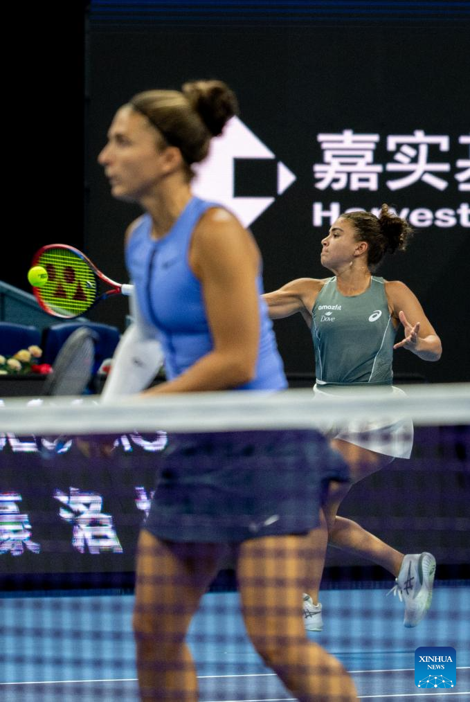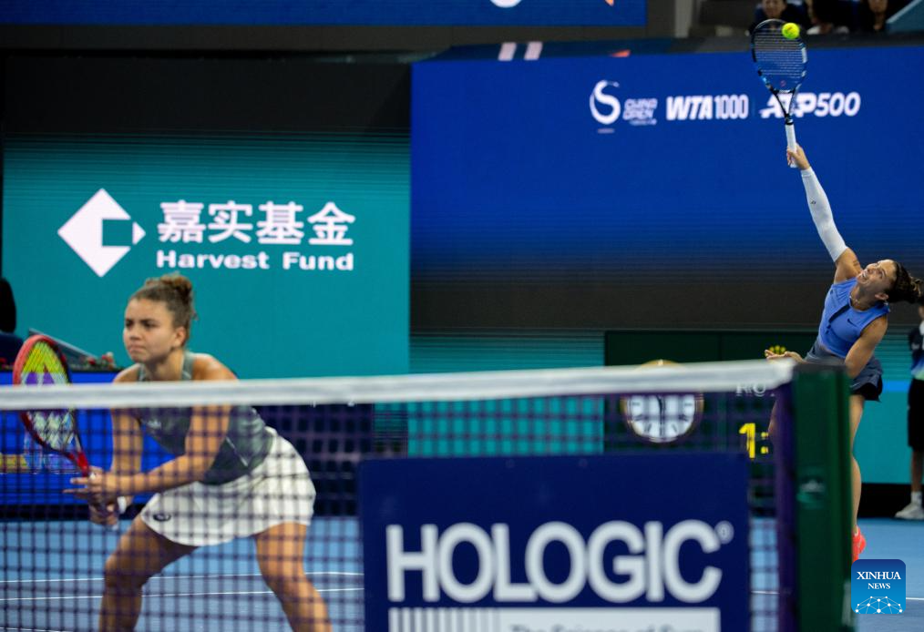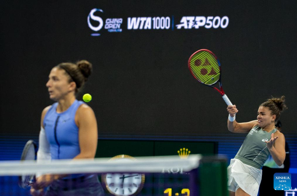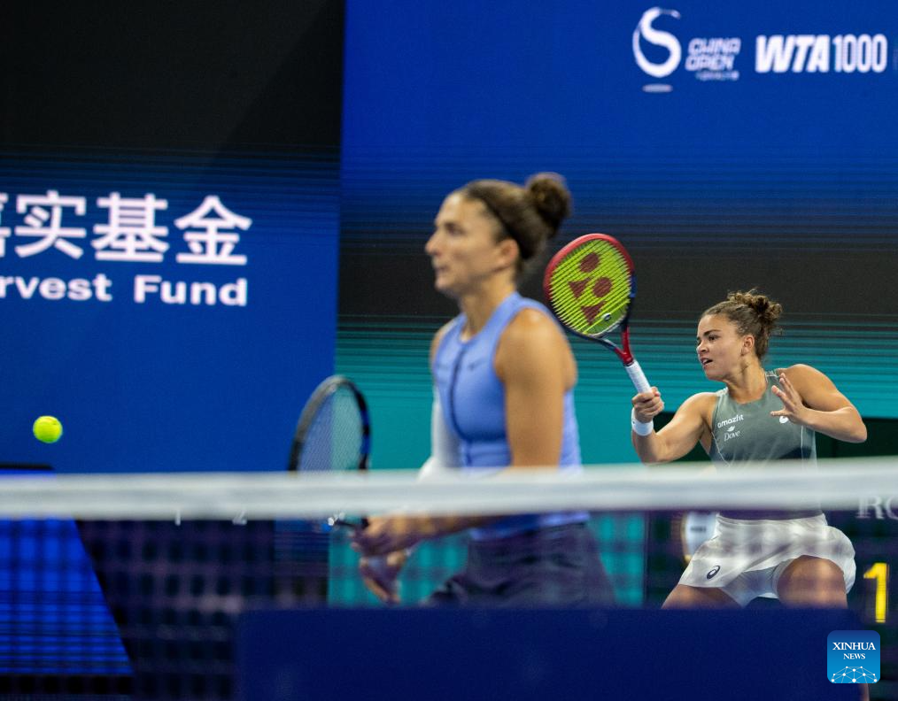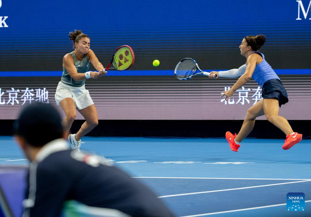 Sara Errani (R)/Jasmine Paolini compete during the women's doubles final between Kato Miyu (Japan)/Fanny Stollar (Hungary) and Sara Errani/Jasmine Paolini of Italy at 2025 China Open tennis tournament in Beijing, China, Oct. 5, 2025. (Xinhua/Hu Jingwen)