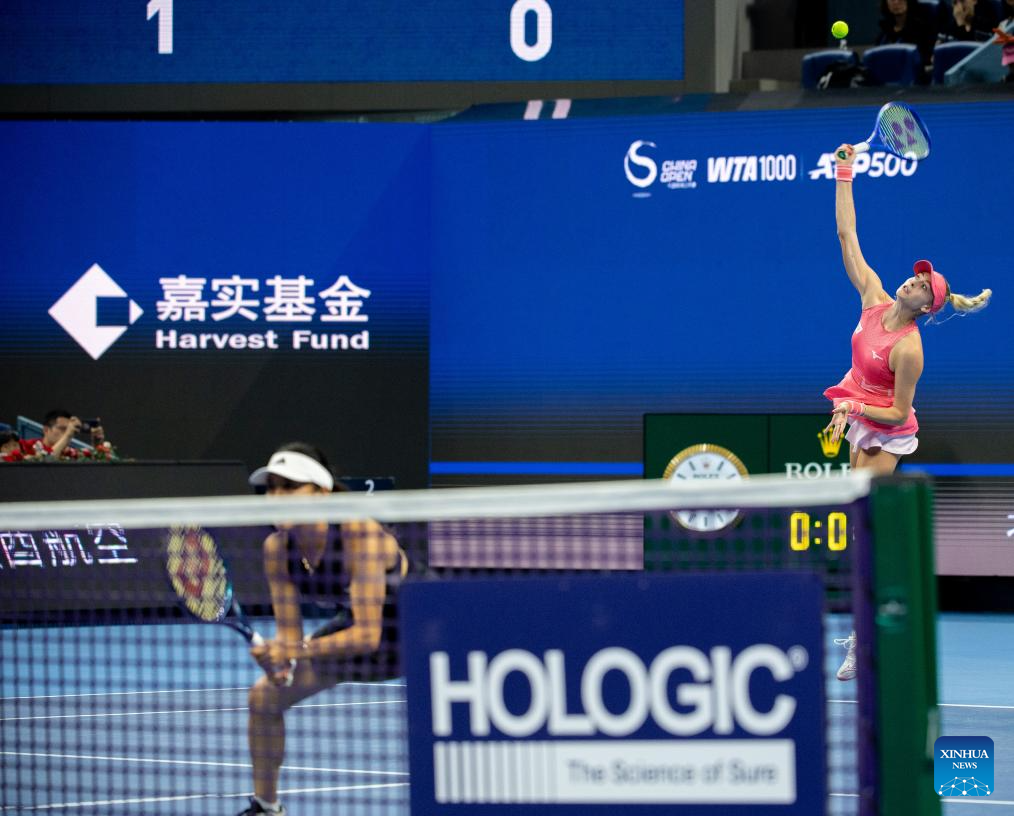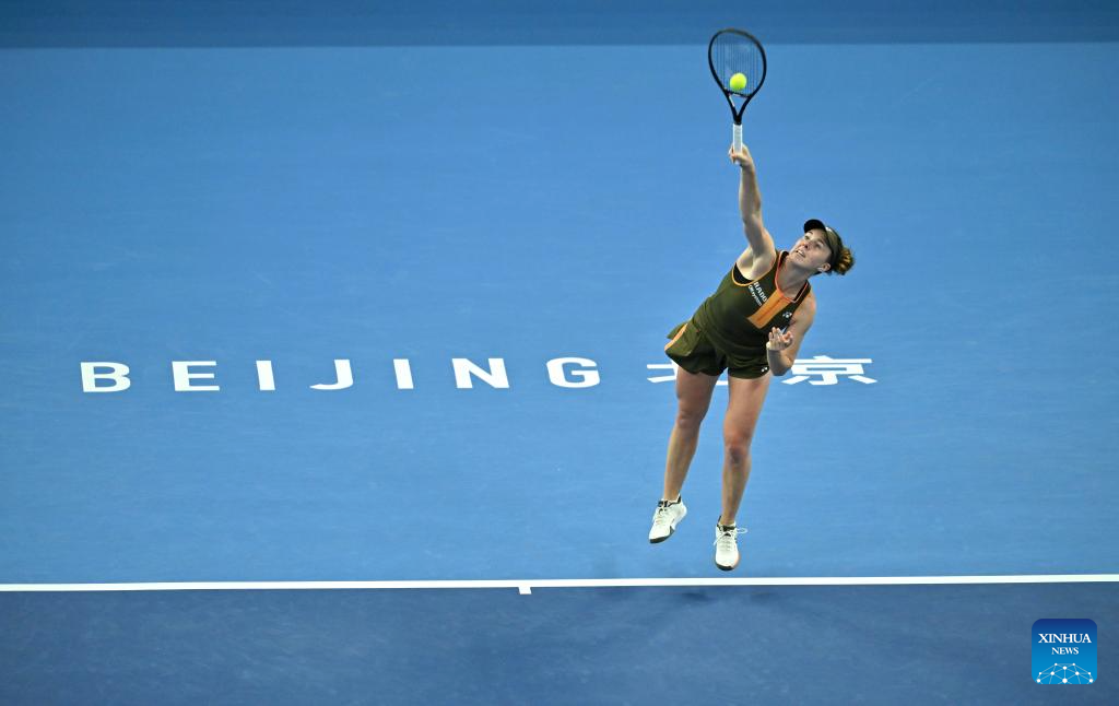 Linda Noskova serves during the women's singles final match between Amanda Anisimova of the United States and Linda Noskova of the Czech Republic at 2025 China Open tennis tournament in Beijing, China, Oct. 5, 2025. (Xinhua/Hu Jingwen)
