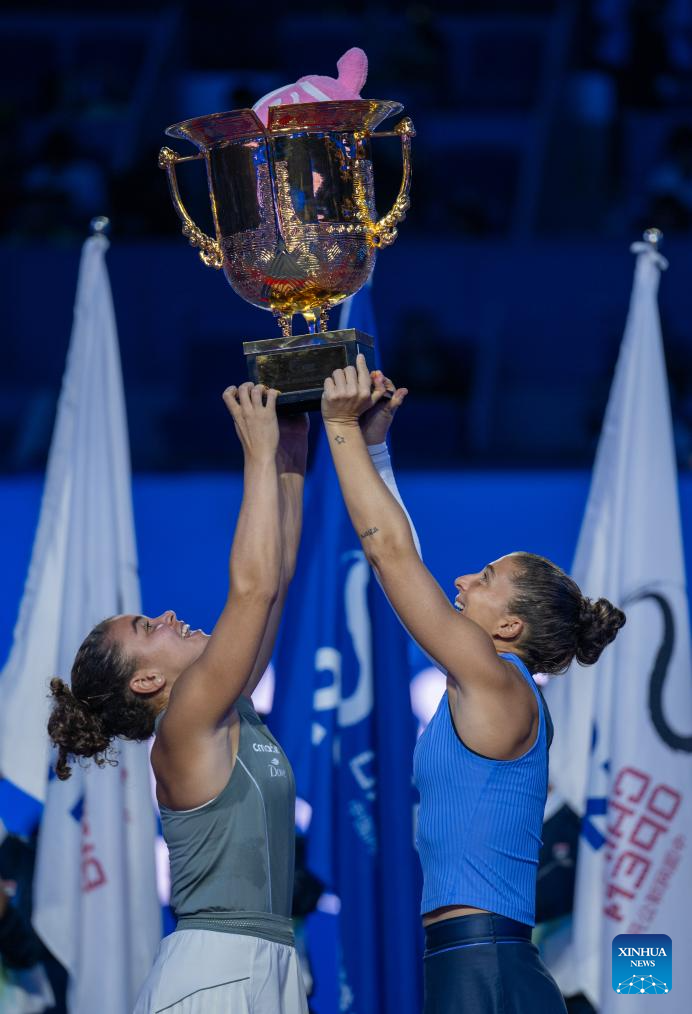 Sara Errani/Jasmine Paolini (L) kiss the trophy during the awarding ceremony for the women's doubles final between Kato Miyu (Japan)/Fanny Stollar (Hungary) and Sara Errani/Jasmine Paolini of Italy at 2025 China Open tennis tournament in Beijing, China, Oct. 5, 2025. (Xinhua/Hu Jingwen)