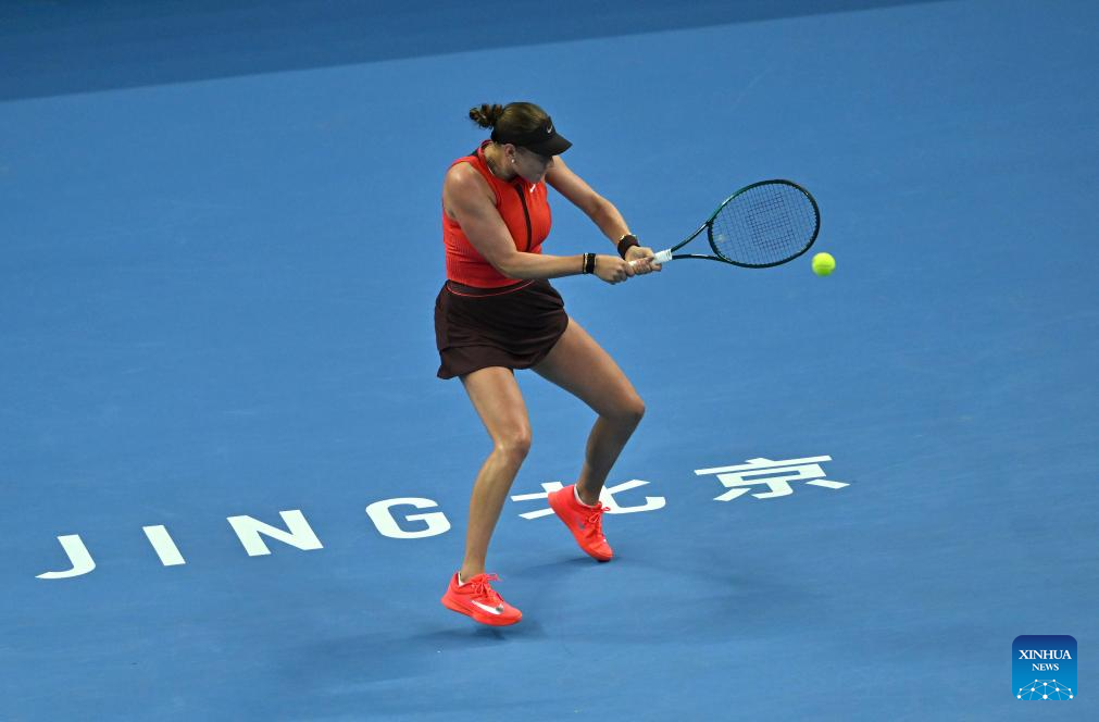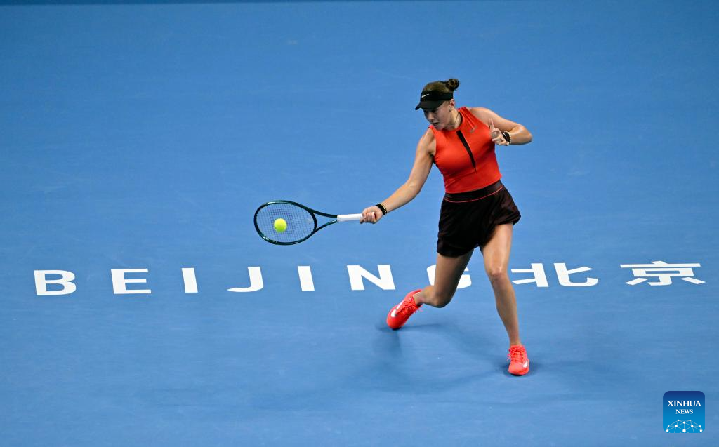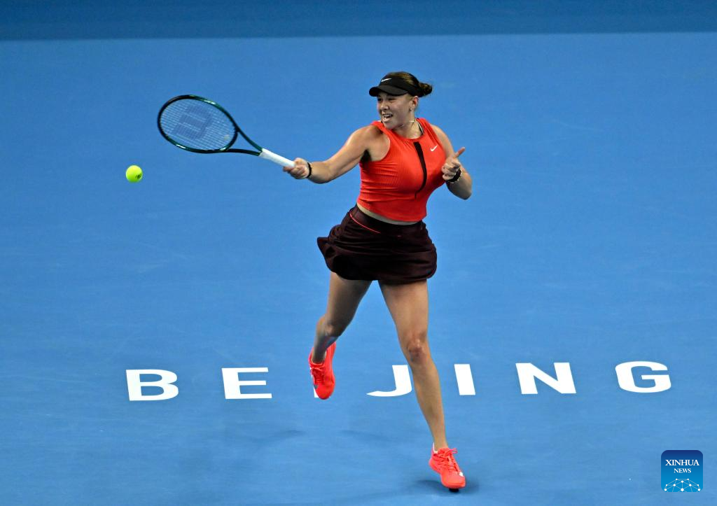 Amanda Anisimova hits a return during the women's singles final match between Amanda Anisimova of the United States and Linda Noskova of the Czech Republic at 2025 China Open tennis tournament in Beijing, China, Oct. 5, 2025. (Xinhua/Bai Xuefei)