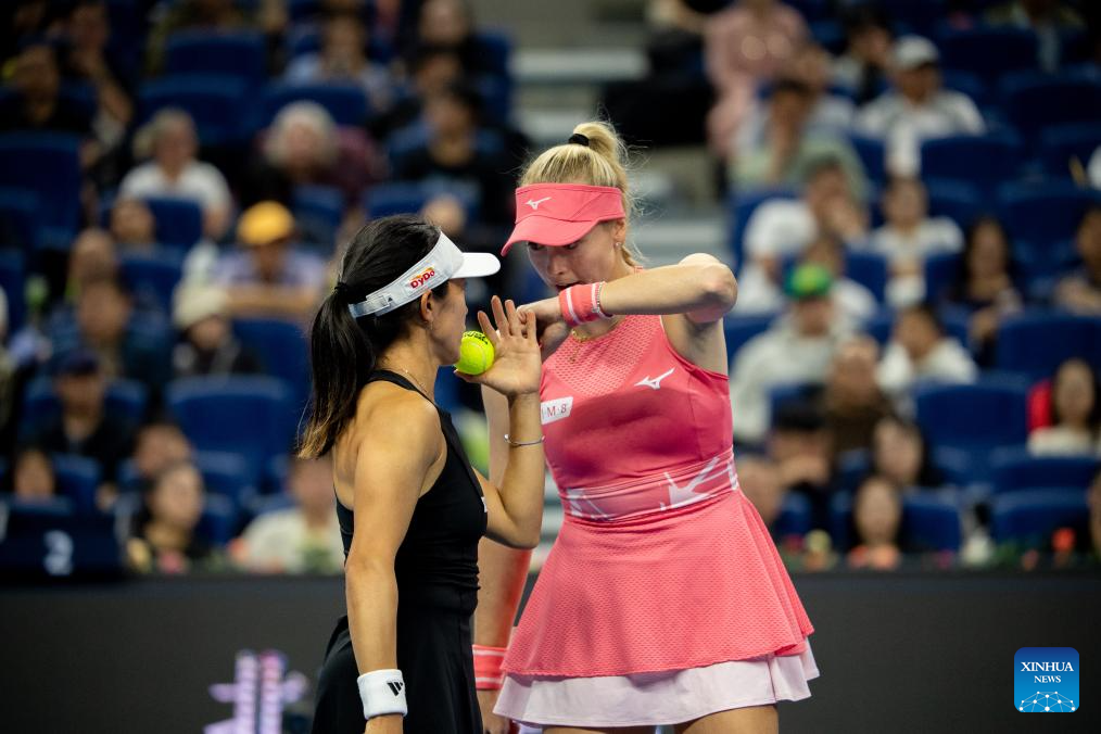 Kato Miyu/Fanny Stollar (R) compete during the women's doubles final between Kato Miyu (Japan)/Fanny Stollar (Hungary) and Sara Errani/Jasmine Paolini of Italy at 2025 China Open tennis tournament in Beijing, China, Oct. 5, 2025. (Xinhua/Hu Jingwen)