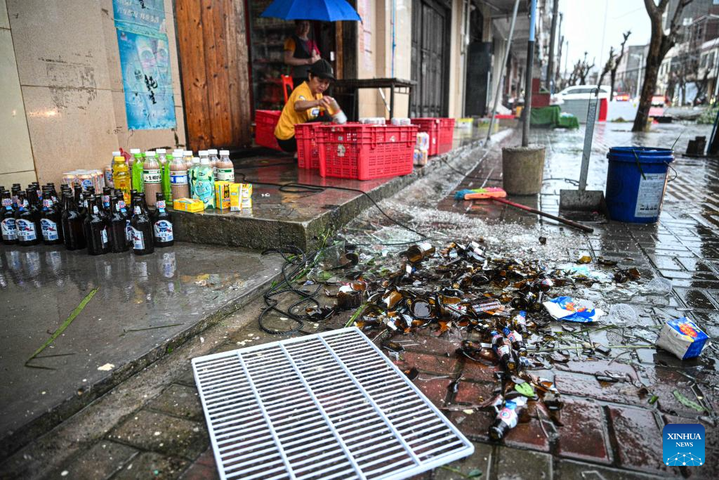 Beer bottles smashed due to strong wind during typhoon Matmo are pictured outside a store in Wenchang, south China's Hainan Province, Oct. 5, 2025. Typhoon Matmo, the 21st named storm of the 2025 Pacific typhoon season, made landfall along the eastern coast of Xuwen County, Zhanjiang City in south China's Guangdong Province around 2:50 p.m. on Sunday, according to Guangdong's meteorological service.