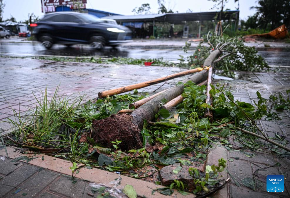 A tree pushed over by strong wind during typhoon Matmo is pictured by a street in Wenchang, south China's Hainan Province, Oct. 5, 2025. Typhoon Matmo, the 21st named storm of the 2025 Pacific typhoon season, made landfall along the eastern coast of Xuwen County, Zhanjiang City in south China's Guangdong Province around 2:50 p.m. on Sunday, according to Guangdong's meteorological service.