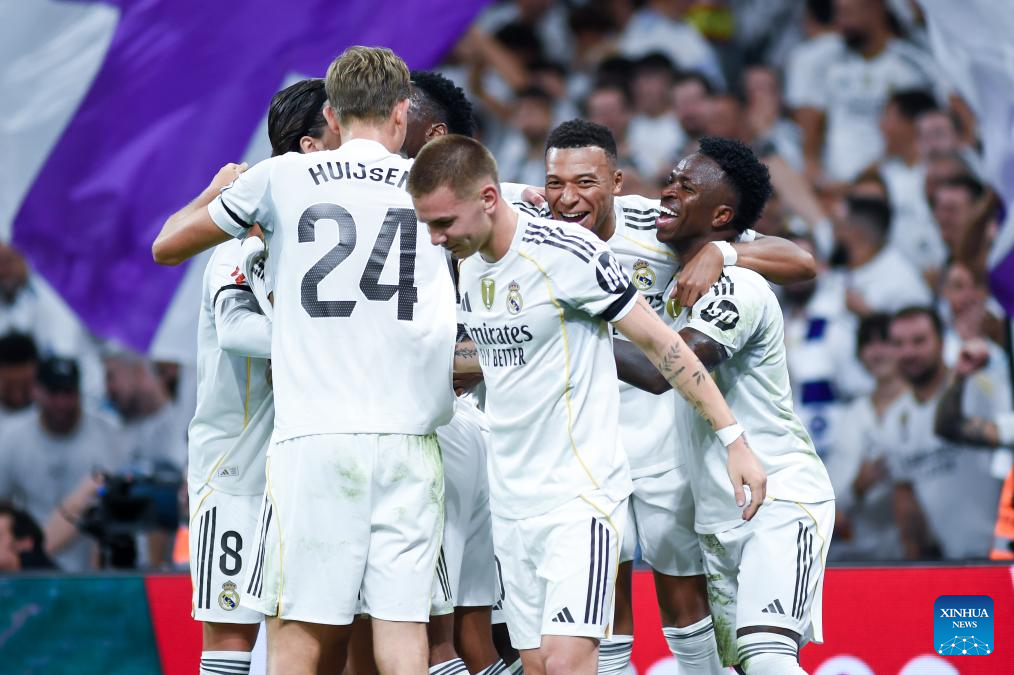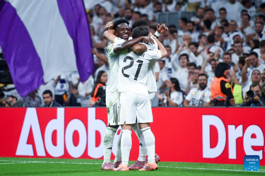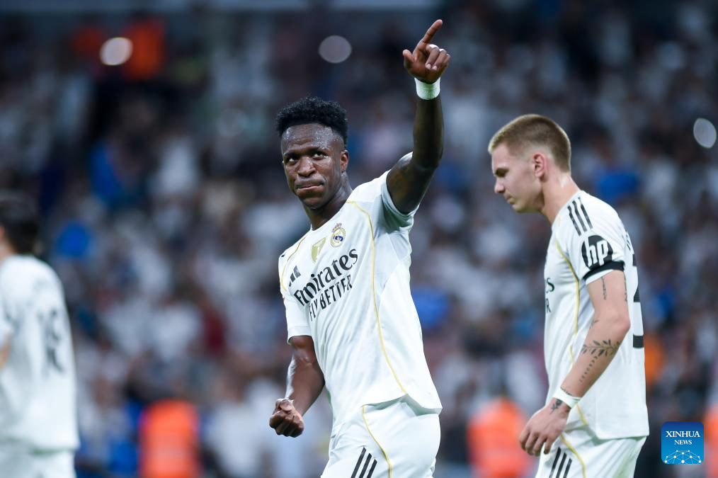 Vinicius Junior (C) of Real Madrid celebrates his goal during the La Liga football match between Real Madrid and Villarreal CF at the Santiago Bernabeu Stadium, Madrid, Spain, on Oct. 4, 2025. (Photo by Gustavo Valiente/Xinhua)
