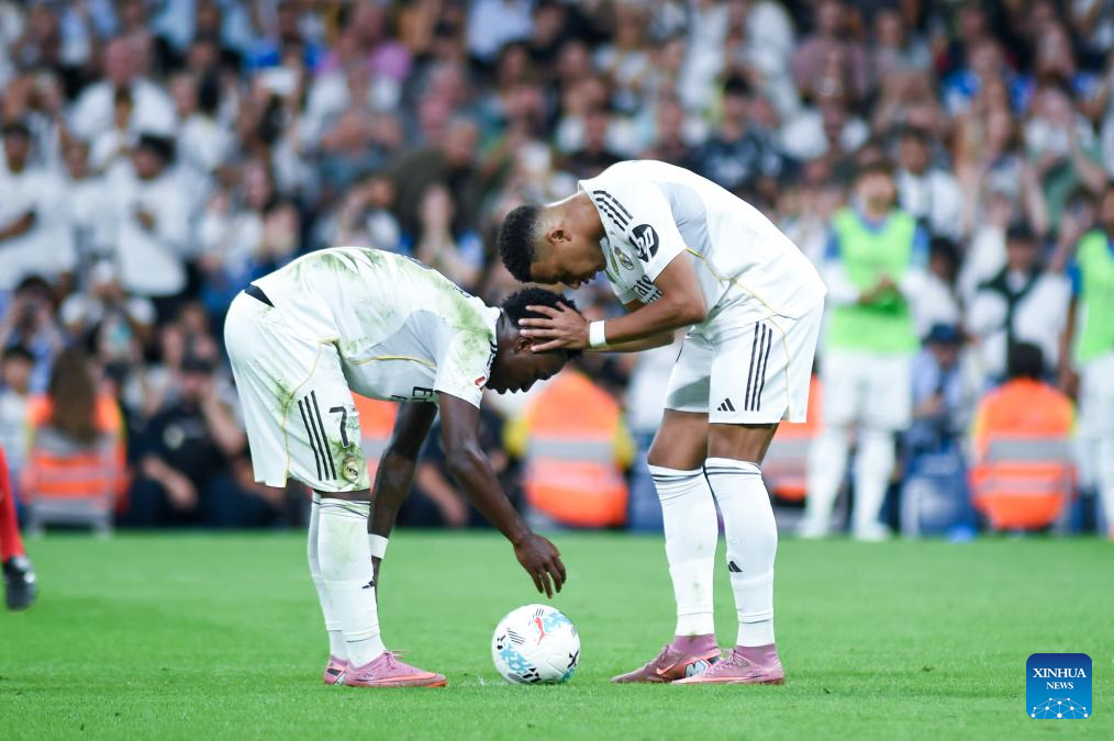 Kylian Mbappe (R) and Vinicius Junior of Real Madrid talk before the penalty kick during the La Liga football match between Real Madrid and Villarreal CF at the Santiago Bernabeu Stadium, Madrid, Spain, on Oct. 4, 2025. (Photo by Gustavo Valiente/Xinhua)