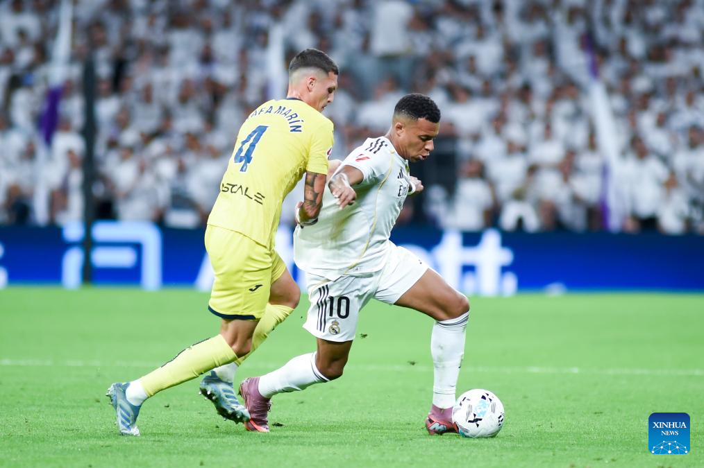 Kylian Mbappe (R) of Real Madrid vies with Rafa Marin of Villarreal CF during the La Liga football match between Real Madrid and Villarreal CF at the Santiago Bernabeu Stadium, Madrid, Spain, on Oct. 4, 2025. (Photo by Gustavo Valiente/Xinhua)