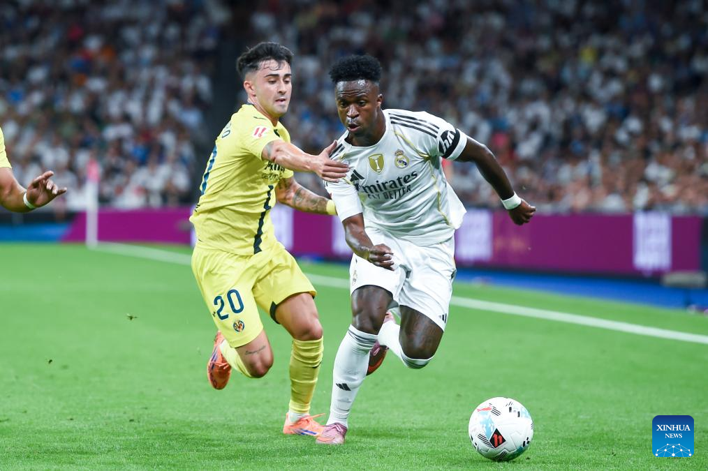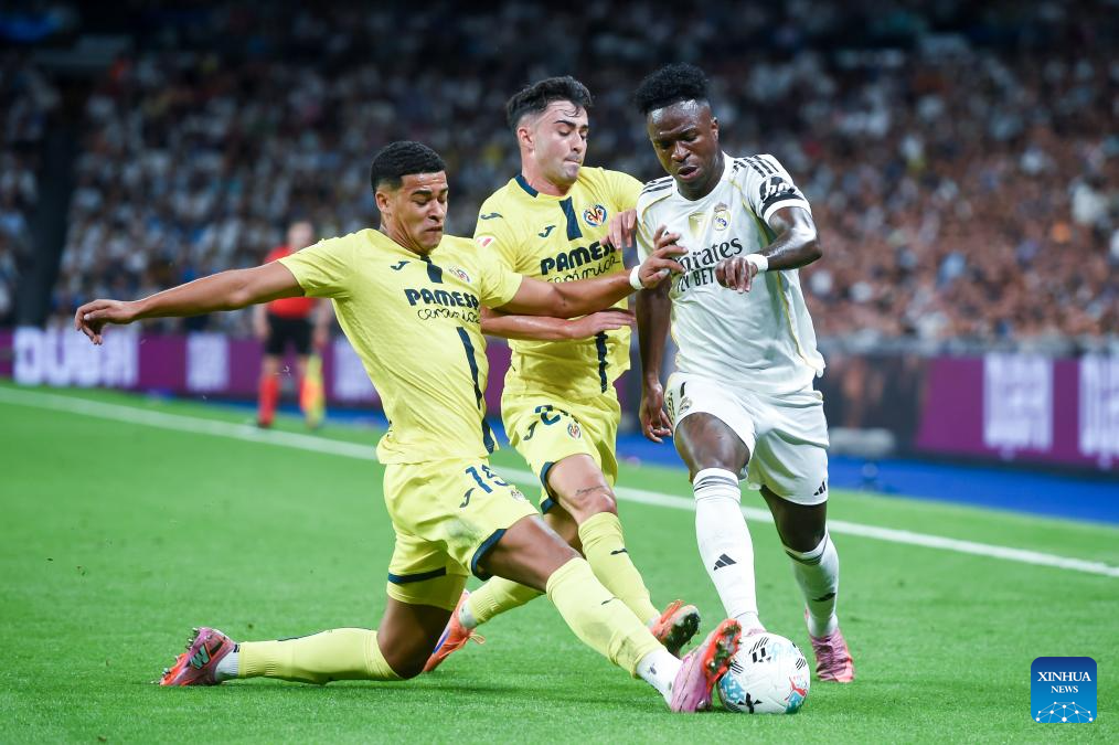 Vinicius Junior (R) of Real Madrid vies with Alberto Moleiro (C) and Santiago Mourino of Villarreal CF during the La Liga football match between Real Madrid and Villarreal CF at the Santiago Bernabeu Stadium, Madrid, Spain, on Oct. 4, 2025. (Photo by Gustavo Valiente/Xinhua)