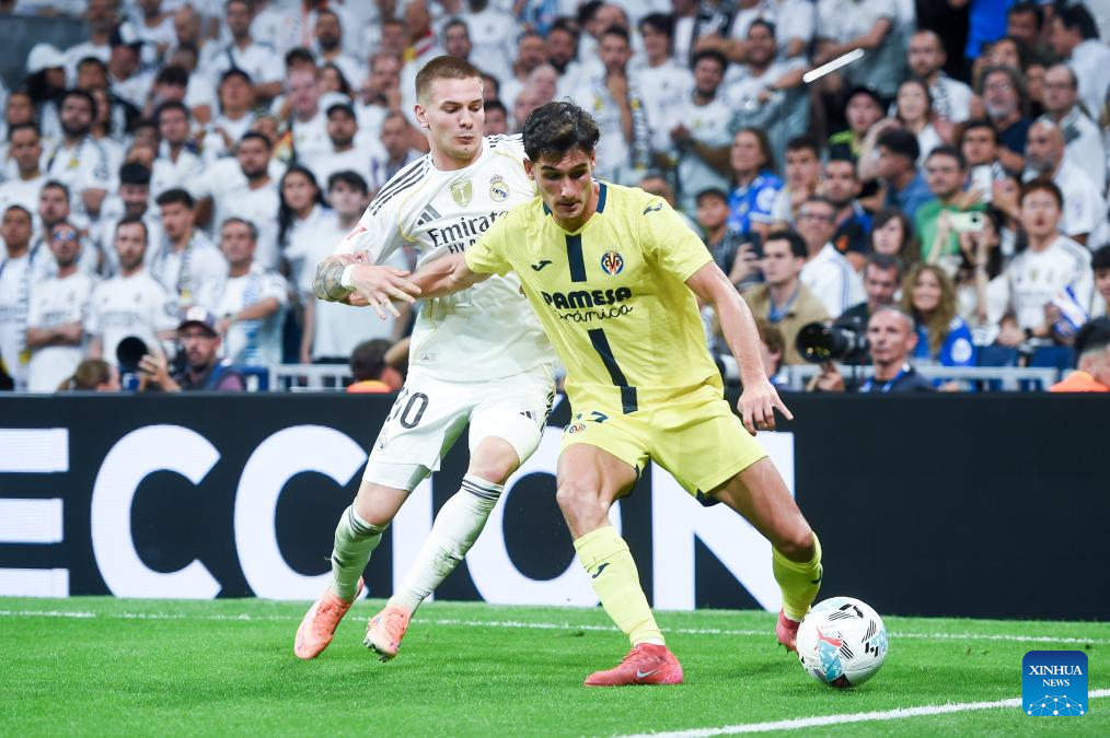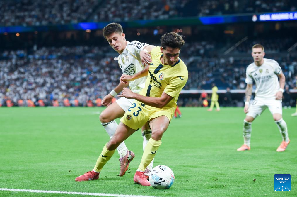 Arda Guler (L) of Real Madrid vies with Sergi Cardona of Villarreal CF during the La Liga football match between Real Madrid and Villarreal CF at the Santiago Bernabeu Stadium, Madrid, Spain, on Oct. 4, 2025. (Photo by Gustavo Valiente/Xinhua)